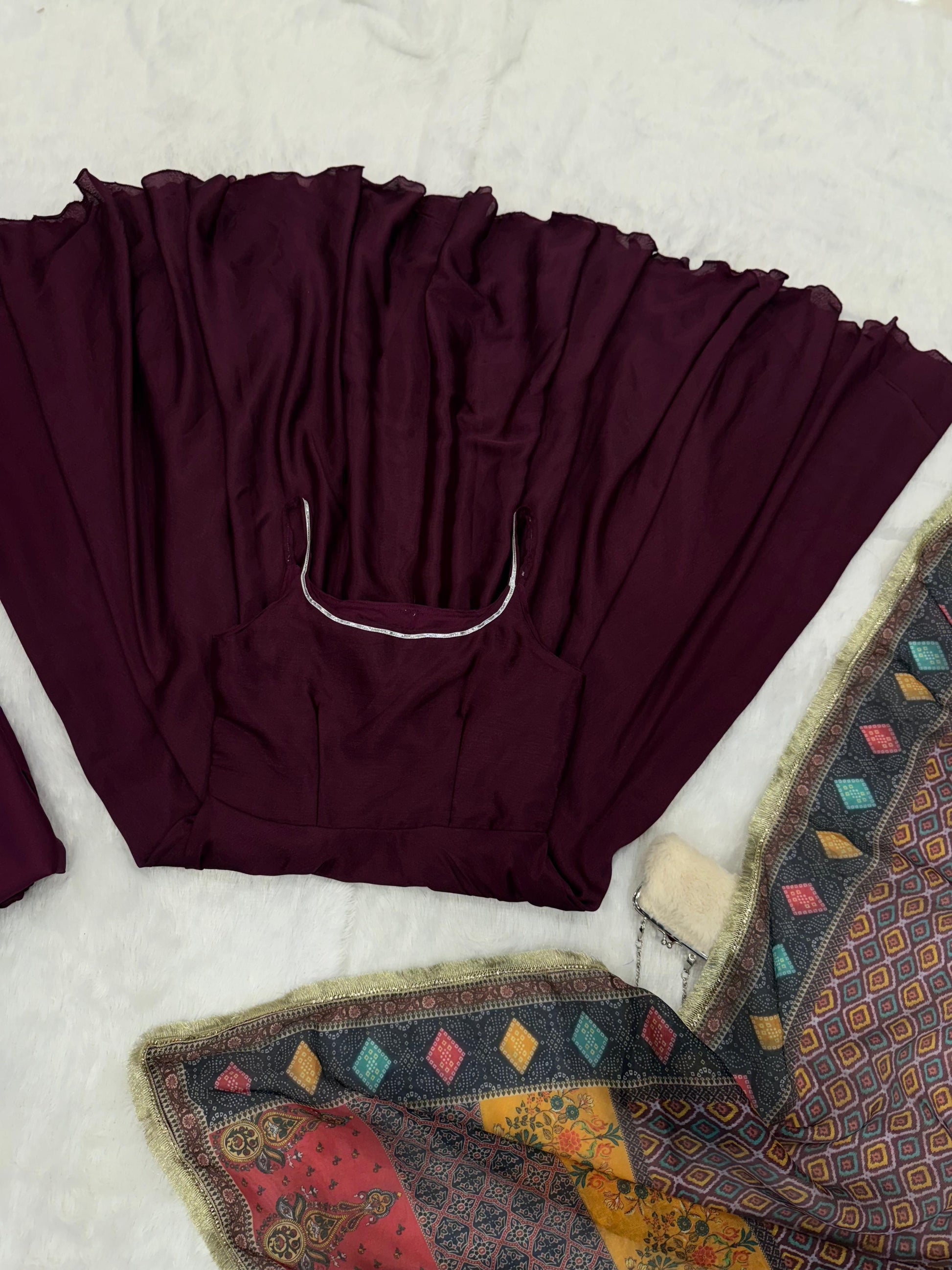 • Anarkali: Pure Chinon fabric with a beautifully flowing huge flair — soft, breathable, and designed for royal drape and comfort.