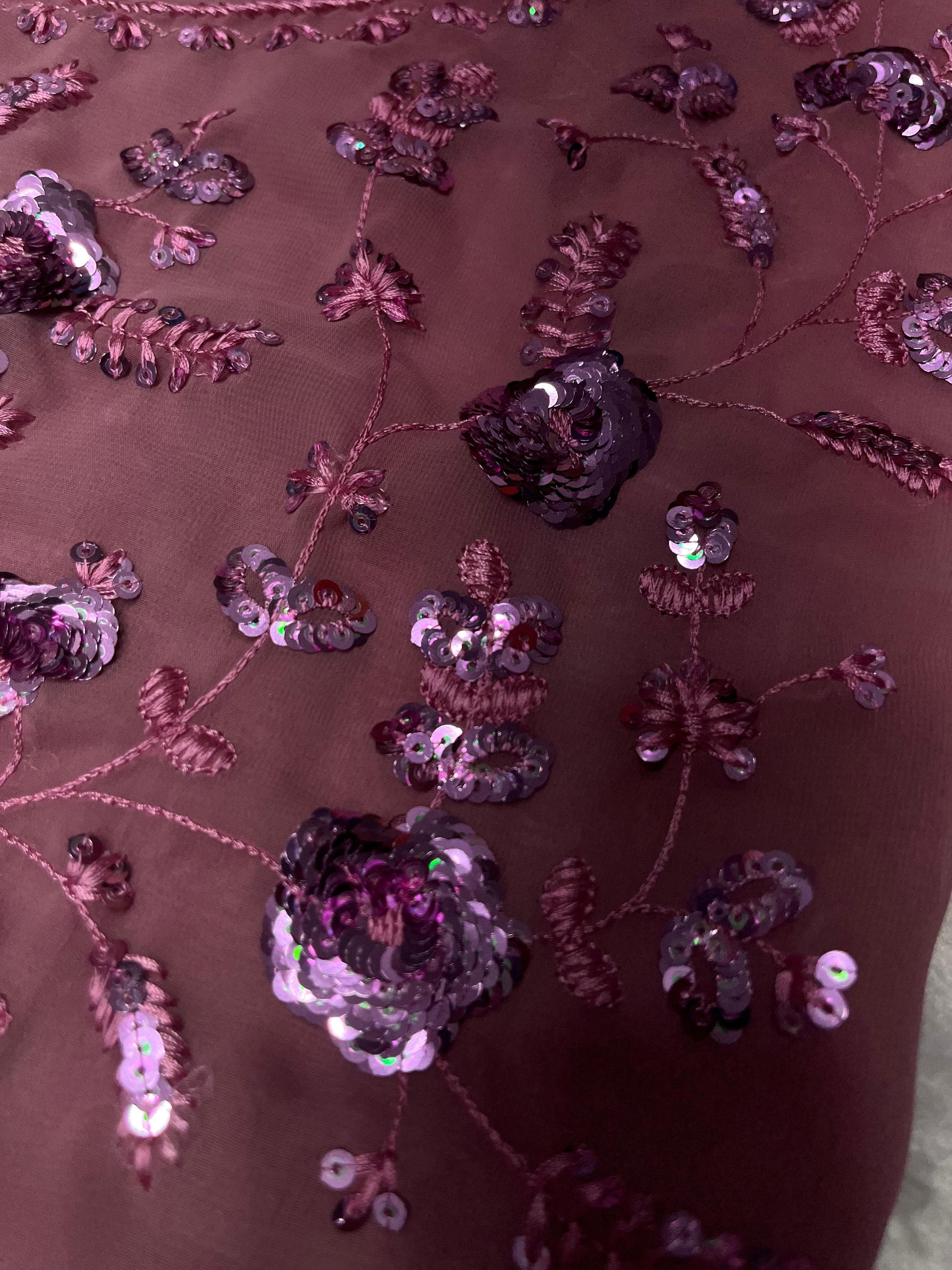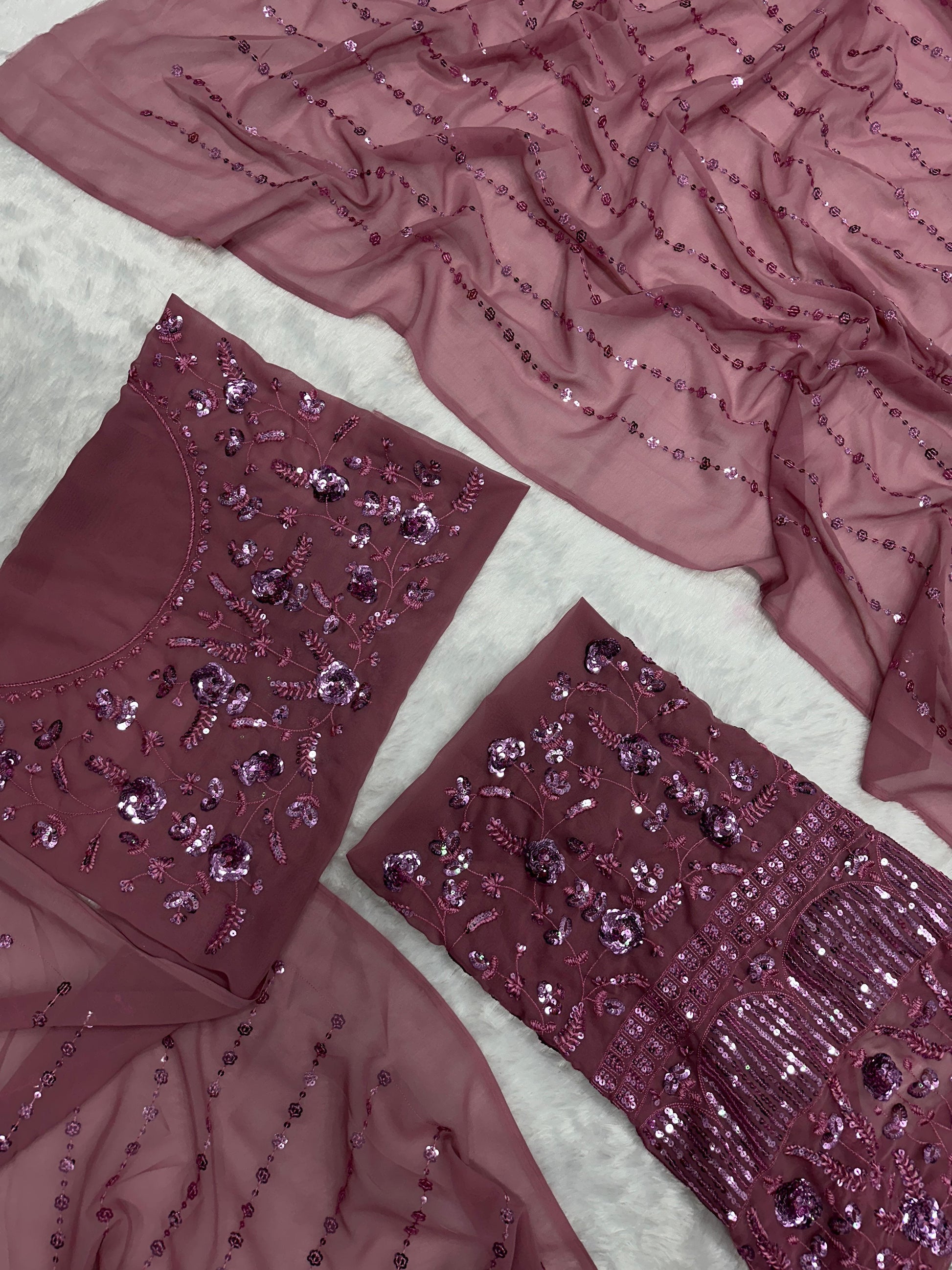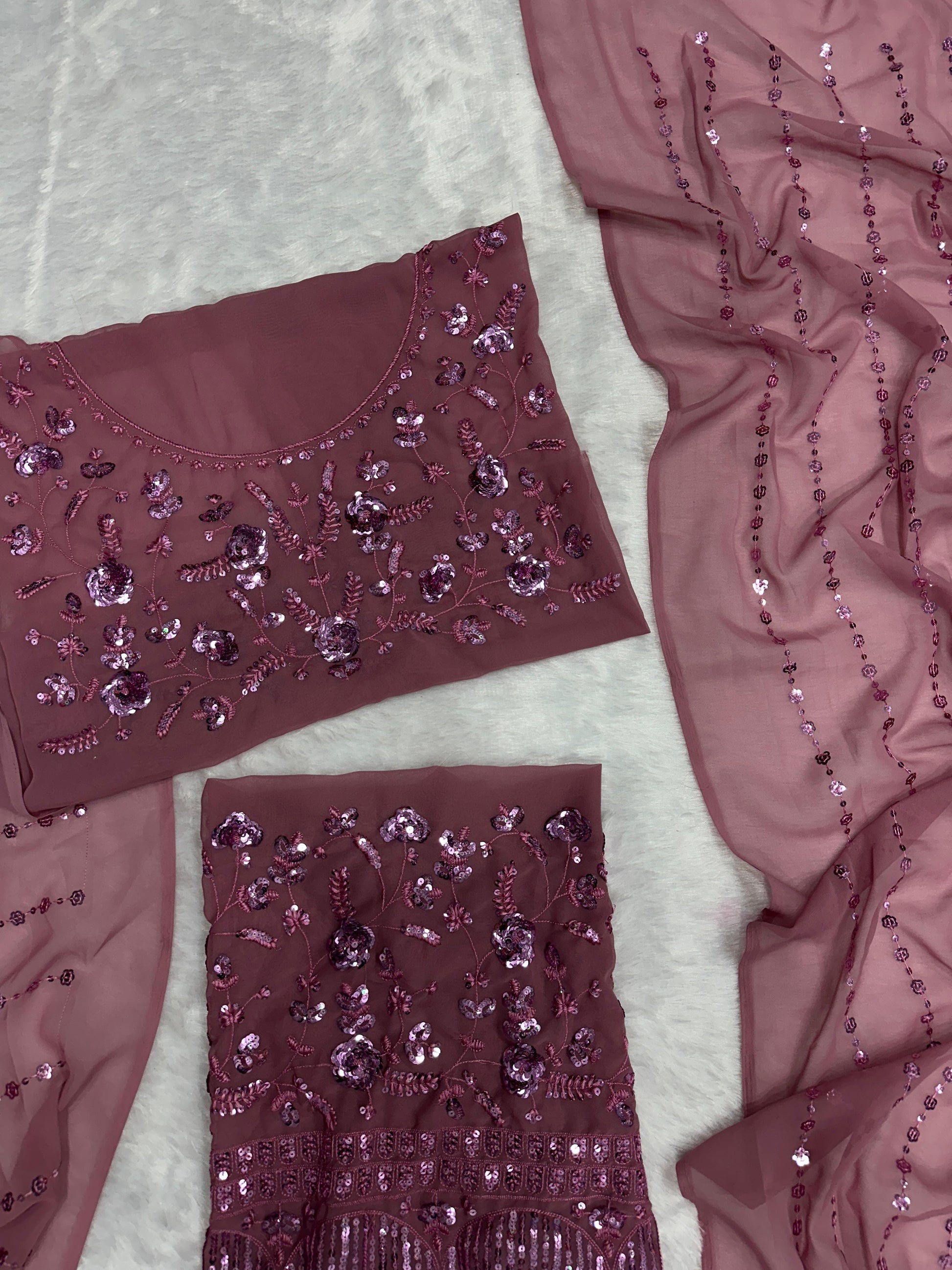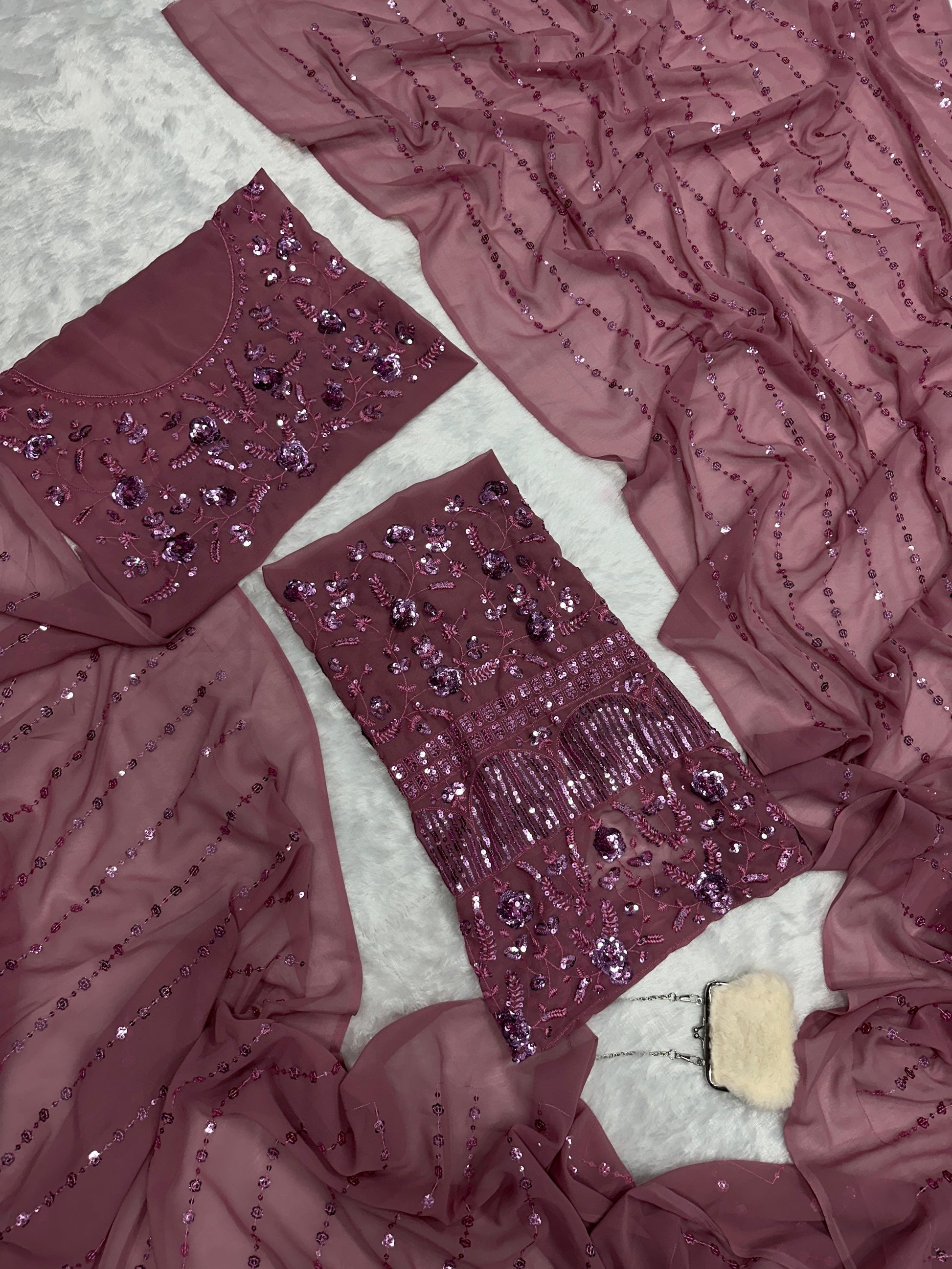 Blouse: Matching pure georgette blouse with dual sequins embroidery and full sleeve design.