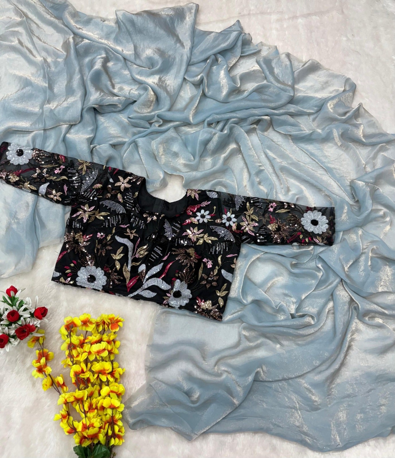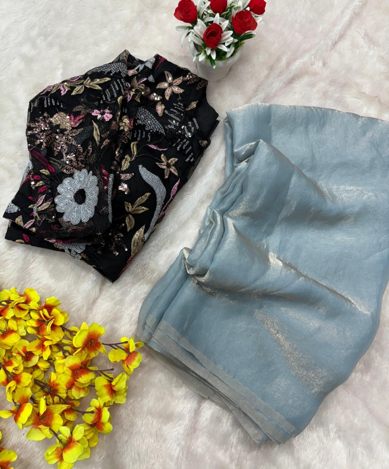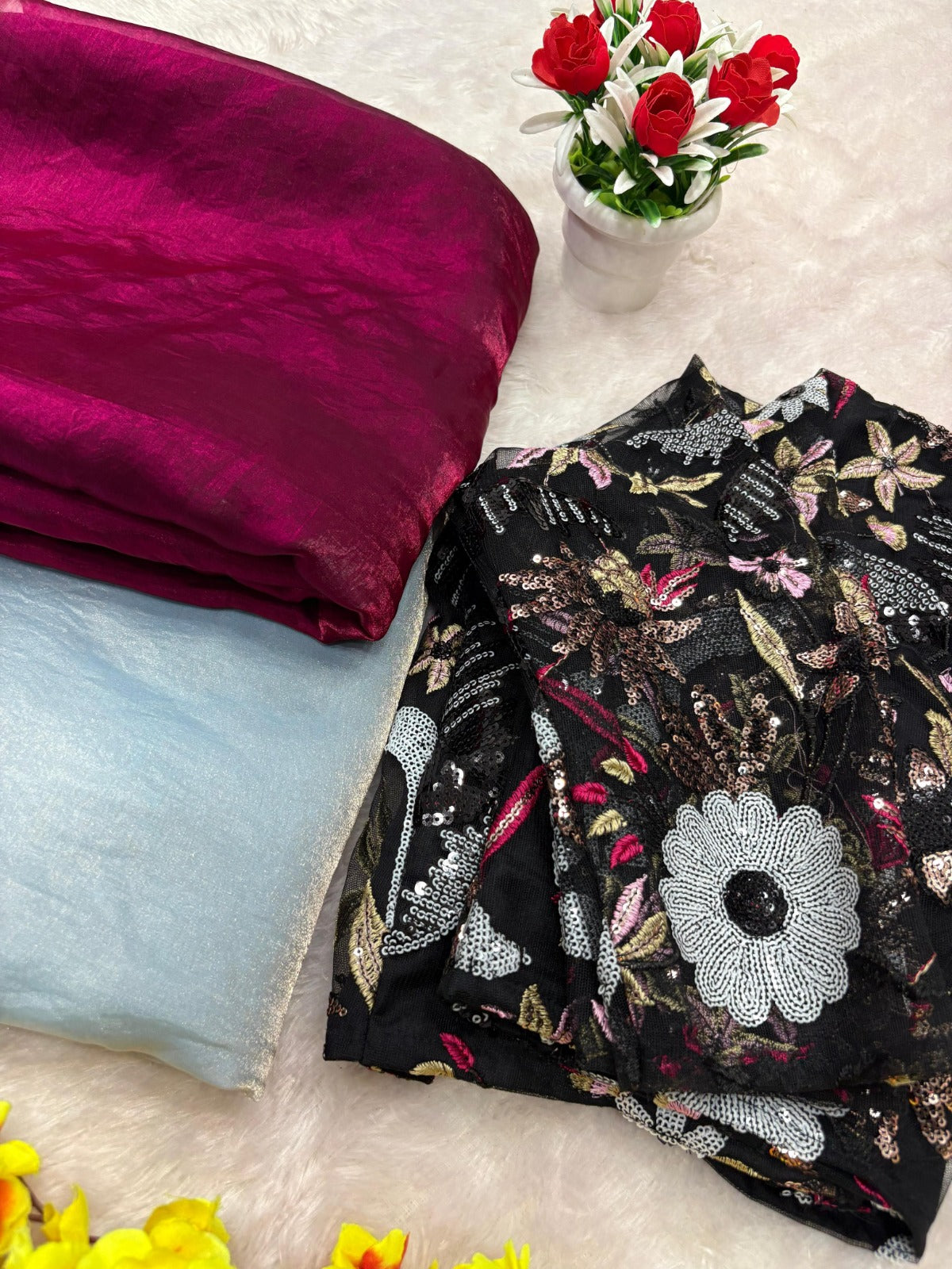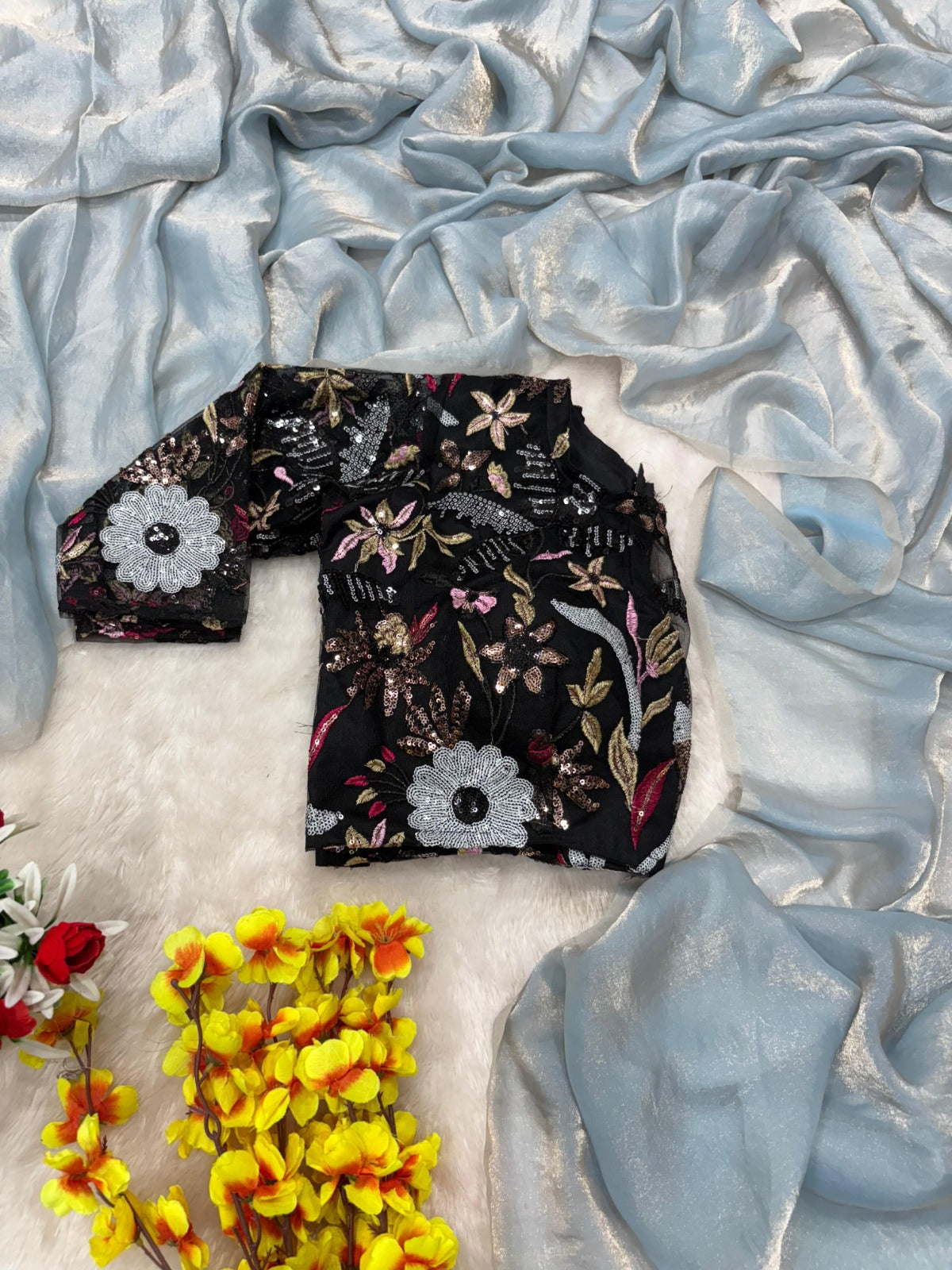 Blouse: Premium soft net blouse piece (1 meter) with intricate 6-sequin embroidery work.